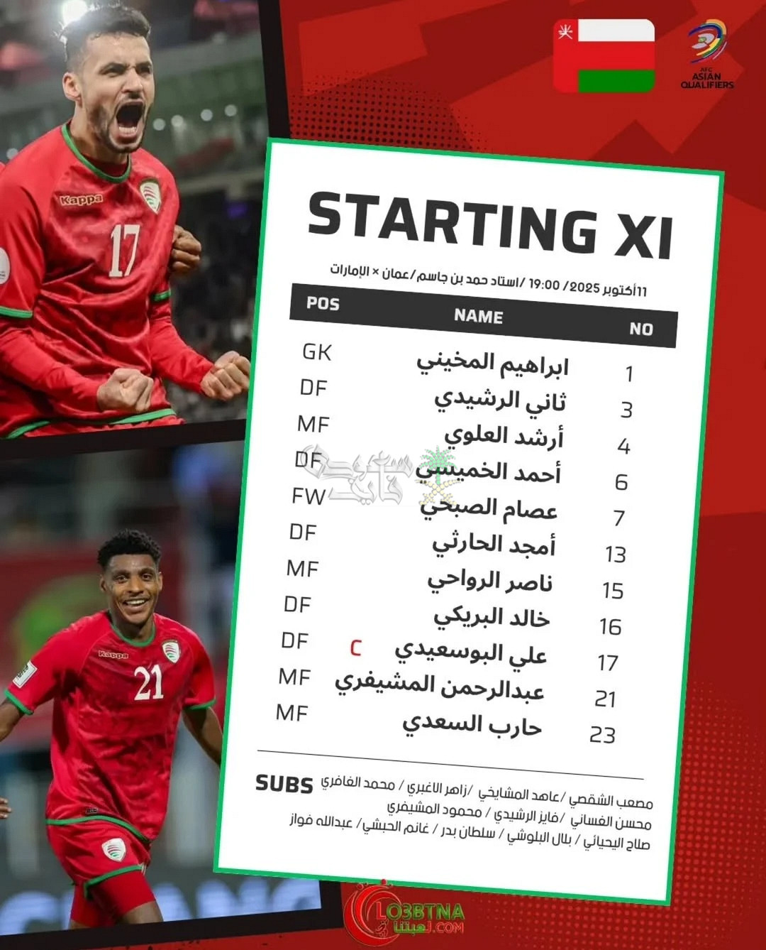 من جانبه، يدخل المنتخب العُماني المواجهة بطموح كبير لتحقيق أول فوز له في هذه المرحلة، بعدما تعادل سلبيًا في الجولة الأولى أمام قطر، وجاءت تشكيلته الرسمية بقيادة الجهاز الفني كالتالي: