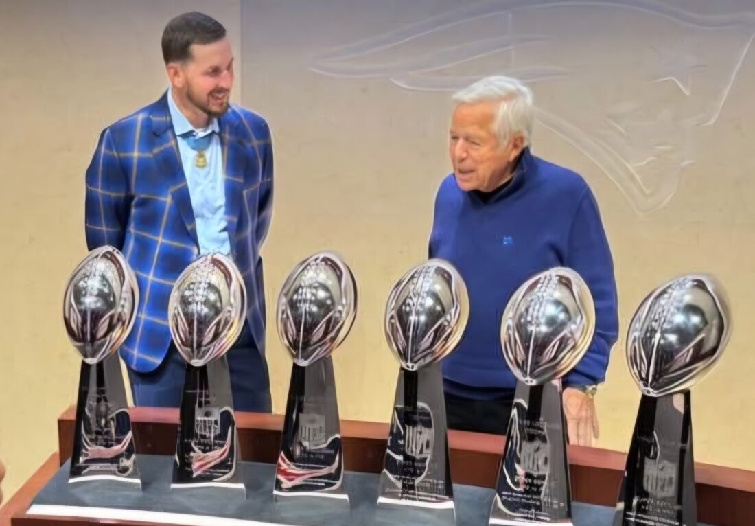 Amherst’s Ryan Pitts is shown in a clip from Amazon Prime’s Thursday Night Football pregame show with Patriots owner Robert Kraft. The show will air prior to kickoff of Thursday night’s Patriots-Jets game at Gillette Stadium. (Amherst Junior Sabers Facebook photo)