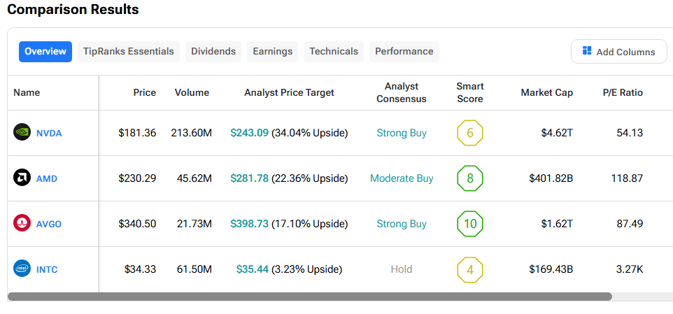 Broadcom also holds a Strong Buy rating, though its upside potential is lower at around 17%. Meanwhile, Intel shows the smallest expected upside at just over 3%, and analysts currently rate the stock as a Hold.