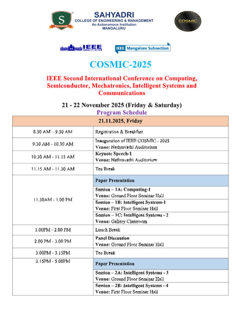 Mangaluru, Nov 19: IEEE Second International Conference on Computing, Semiconductor, Mechatronics, Intelligent Systems and Communications (COSMIC-2025) will be held on November 21-22, in the serene premises of Sahyadri College of Engineering & Management in the region of Mangaluru.
