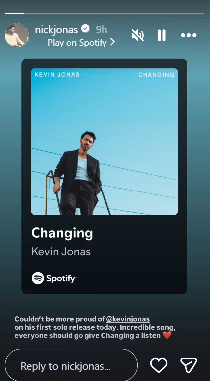 “Couldn’t be more proud of @kevinjonas on his first solo release today. Incredible song, everyone should go give ‘Changing’ a listen,” Nick Jonas wrote with a red-heart emoticon.