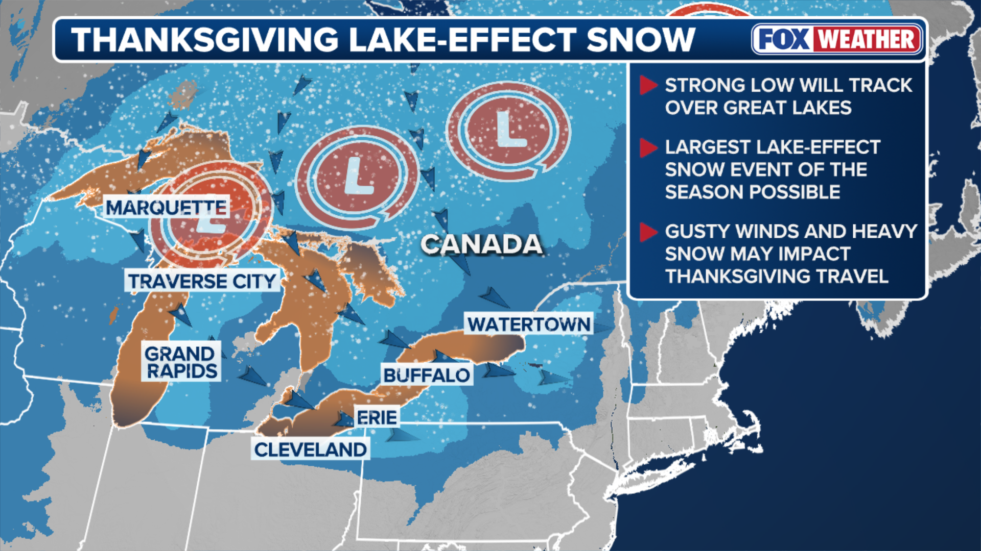 Thanksgiving travel could be snarled across the Great Lakes Snowbelts, as the FOX Forecast Center tracks what it expects to be the most significant lake-effect snow event of the season thus far beginning Wednesday and lasting through Thanksgiving Day and into Black Friday.