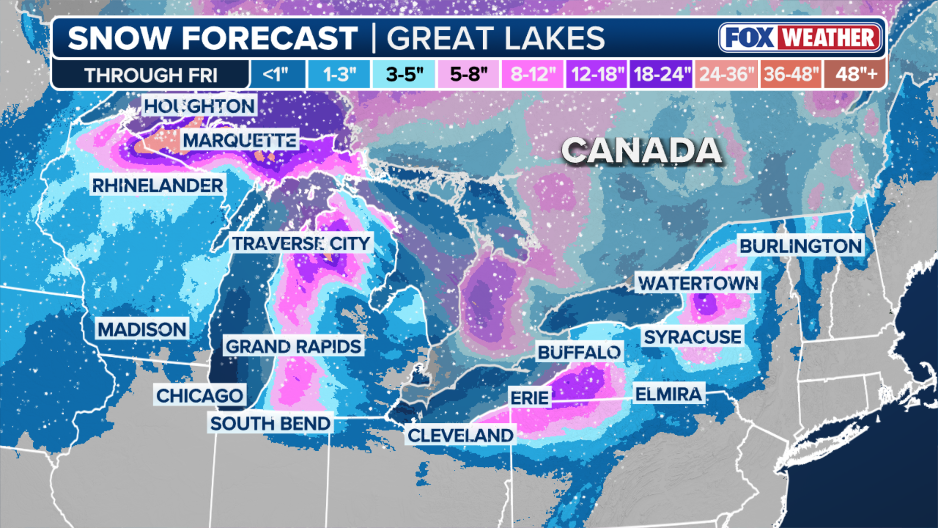Some Snowbelt locales in Ohio, Pennsylvania and western New York could see a foot of snow or more through Black Friday.