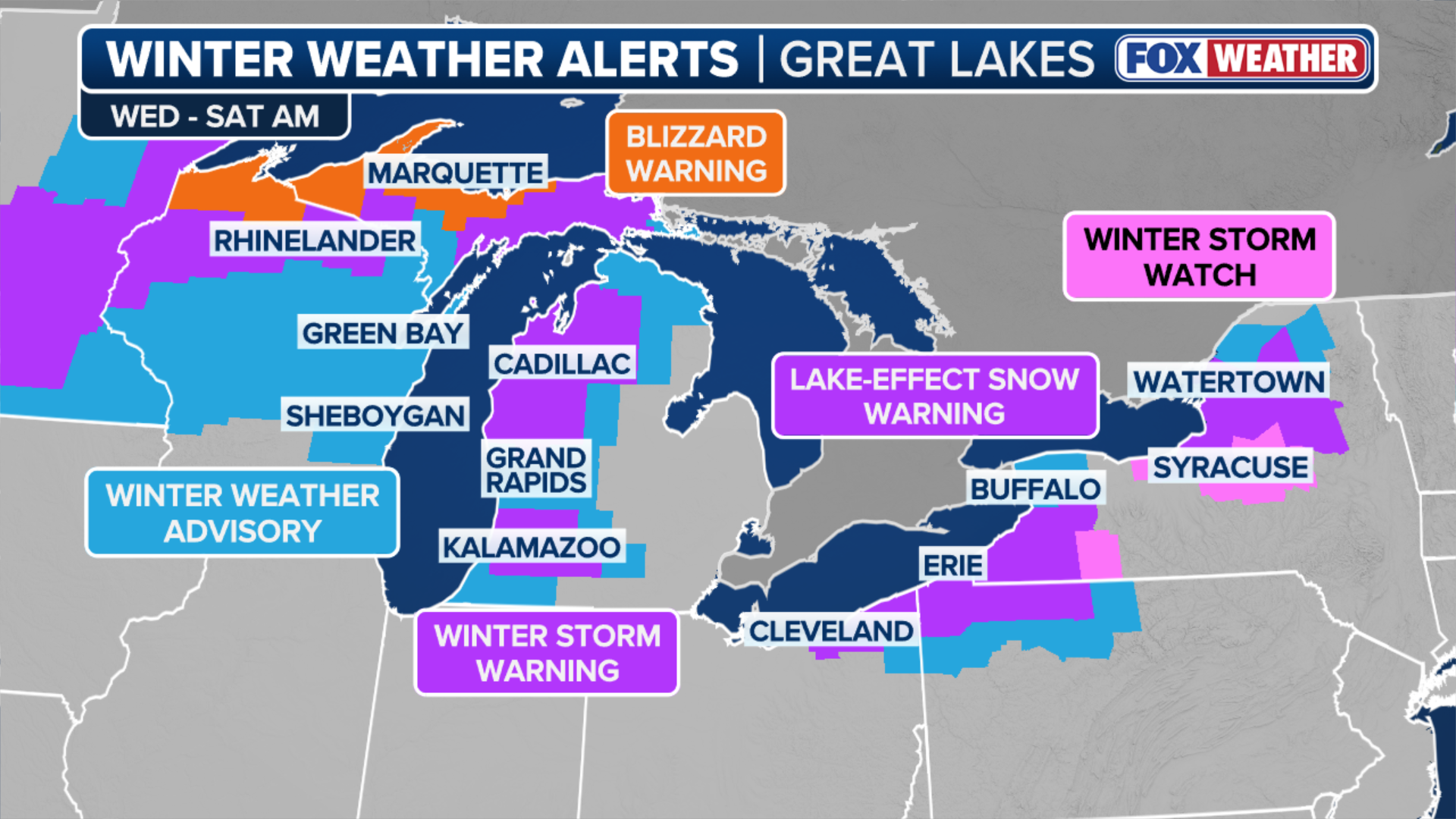 Wind gusts of 50 mph will be possible across Michigan’s Upper Peninsula, as well as places downwind of Lakes Erie and Ontario in Ohio, western Pennsylvania and western New York, which will create periods of whiteout and life-threatening driving conditions through Friday.