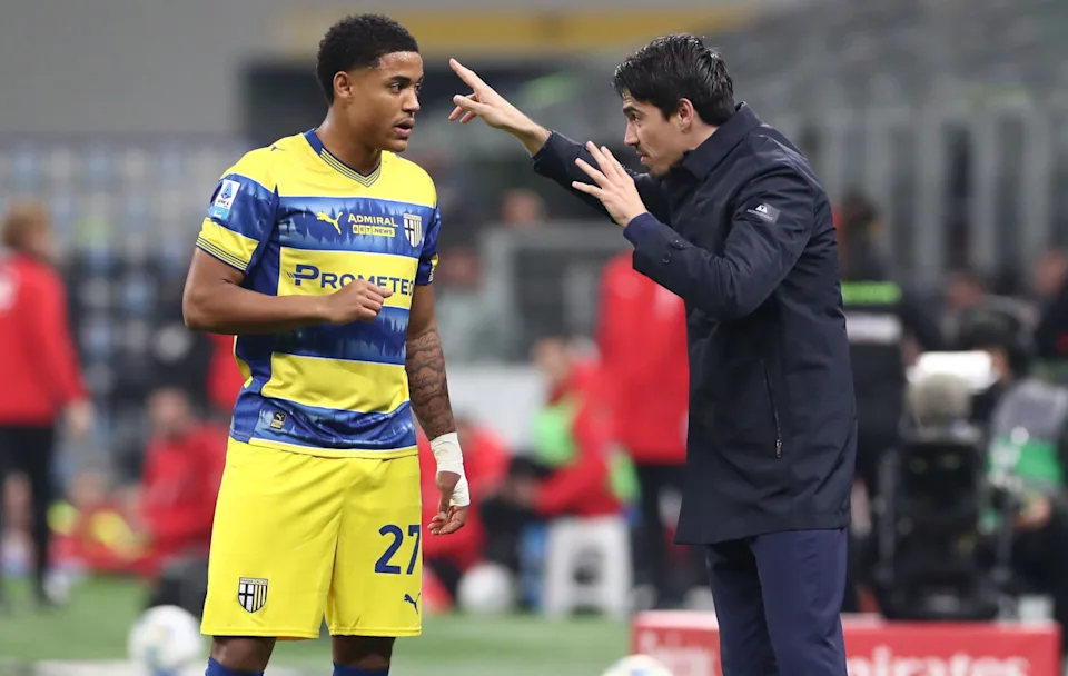 MILAN, ITALY – FEBRUARY 22: Carlos Cuesta issues instructions to his player Sascha Britschgi during the Serie A match at Giuseppe Meazza Stadium on February 22, 2026 in Milan, Italy. (Photo by Marco Luzzani/Getty Images)