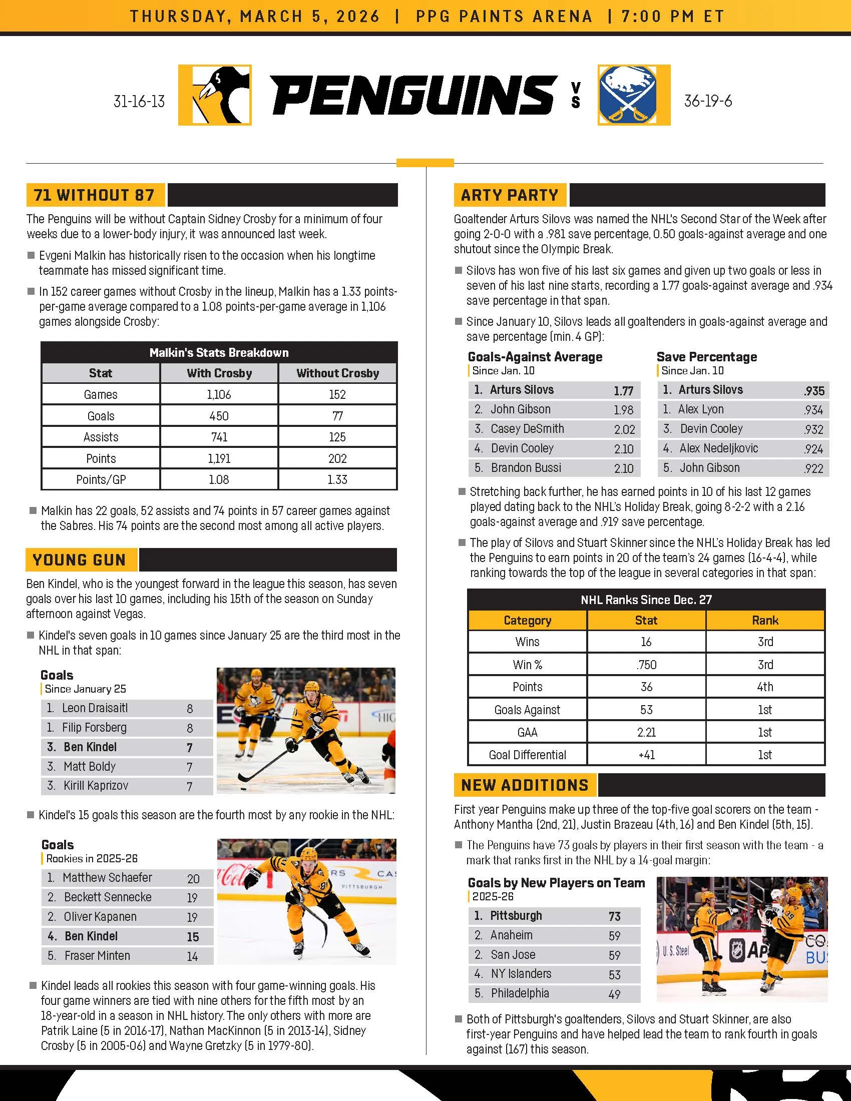 Who: Buffalo Sabres (36-19-6, 78 points, 2nd place Atlantic Division) @ Pittsburgh Penguins (31-16-13, 75 points, 2nd place Metropolitan Division)