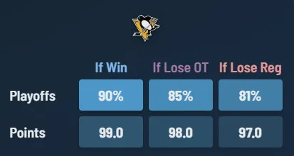 It’s that time of year to white-knuckle it over every out of town score and point gained or lost. Here’s what hockeystats.com has with their model for the Pens’ outlook based on tonight, entering the day with an 85% chance of the playoffs