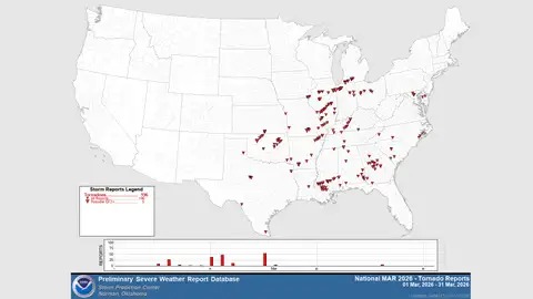 This plot shows both confirmed and reports of tornadoes in March 2026 through early morning, March 31.