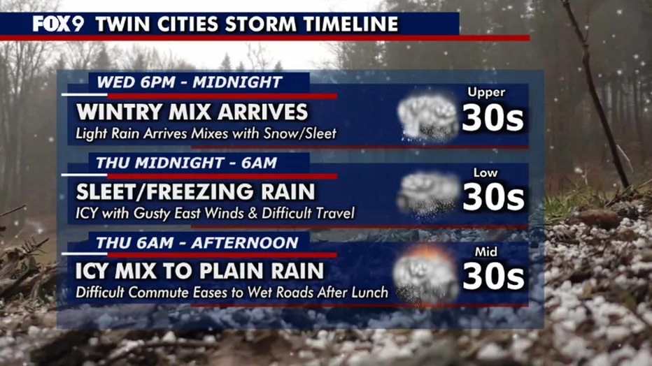 MINNEAPOLIS (FOX 9) – An overnight mix of freezing rain, snow and ice is expected to create a treacherous commute on Thursday morning.