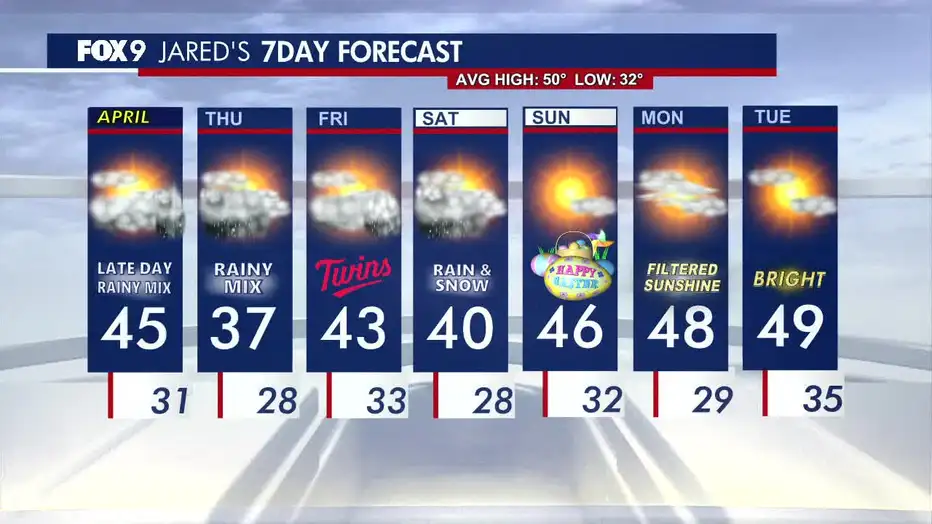 Wednesday starts fairly quiet across Minnesota, with increasing clouds through the day. Temperatures hover in the mid-40s, running slightly below average, with a light northeast breeze.